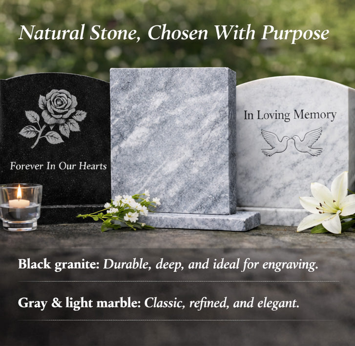Black granite is selected for its exceptional durability, deep color, and resistance to weather, making it ideal for detailed engraving and long-term outdoor use.