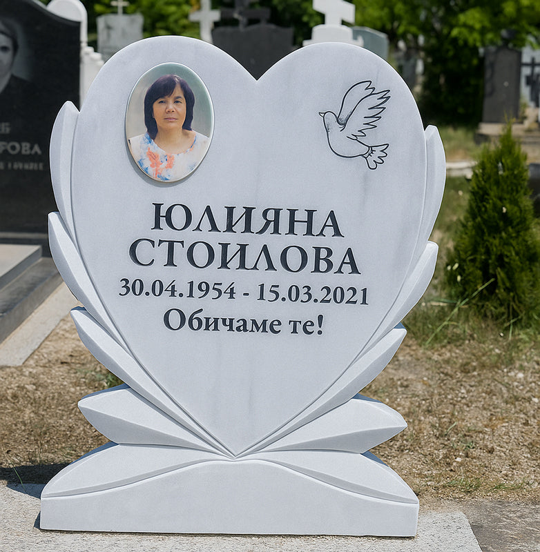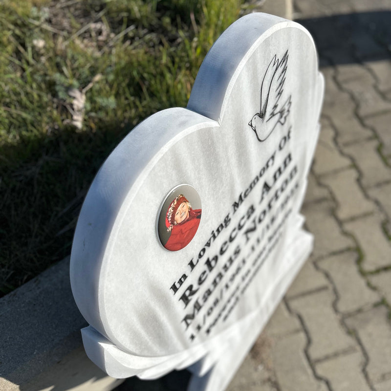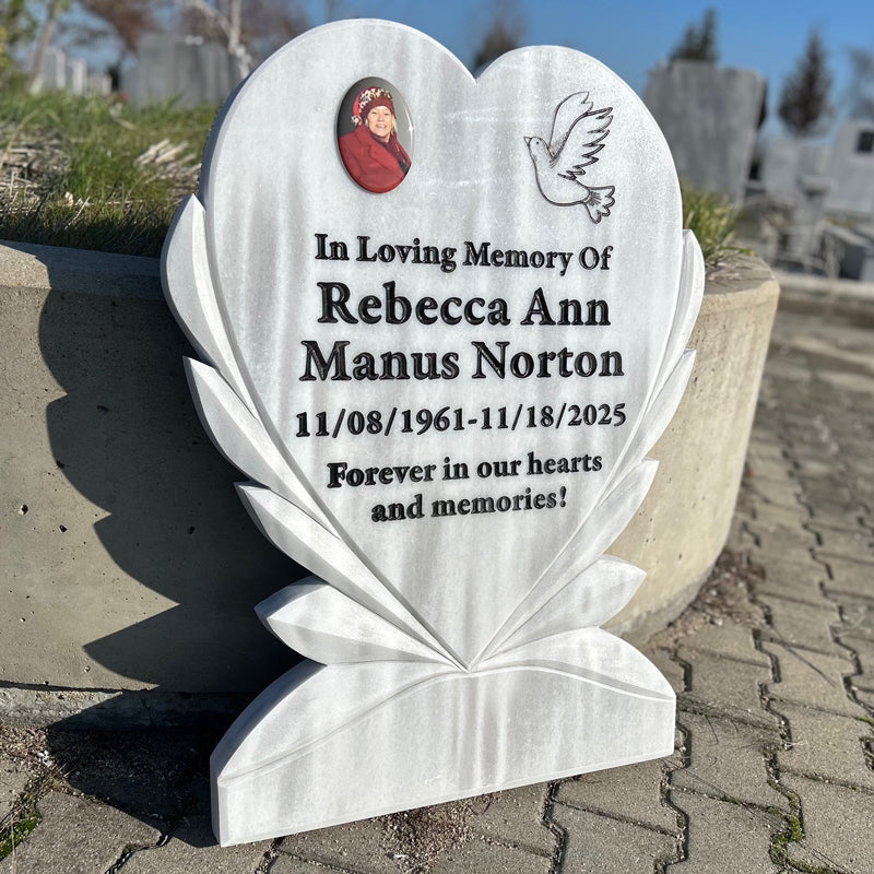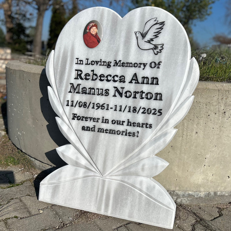 Graviertes Grabstein aus weißem Marmor in Herzform – Gedenkstein mit Taube, 90 x 70 cm