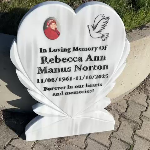Dieser herzförmige Grabstein aus strahlend weißem Marmor ist ein mitfühlendes Denkmal und eine bleibende Erinnerung an Ihre Lieben. Mit einer Größe von 90 x 70 cm (35„ x 28“) bietet er eine beeindruckende Präsenz und behält gleichzeitig elegante Proportionen bei. Das zarte Taubenmotiv symbolisiert Frieden und spirituellen Trost und ist wunderschön in hochwertigen Marmor eingraviert, der aufgrund seiner Festigkeit und zeitlosen Schönheit ausgewählt wurde. Personalisieren Sie ihn mit Namen, Daten und bedeutungsvollen Worten, um einen Ort der Erinnerung zu schaffen. Dieser dauerhafte Grabstein ehrt wertvolle Erinnerungen und bietet einen friedlichen Ort der Besinnung und Verbundenheit über die Jahre hinweg.